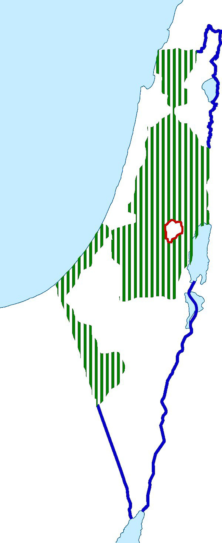 En blanc, les surfaces proposées à Israël dans le plan de partage de la Palestine par l’AG de l’ONU en nov 1947. Jérusalem est sous contrôle international. Deux points de croisement extraterritoriaux sous contrôle international assurent la continuité des territoires juifs et palestiniens.