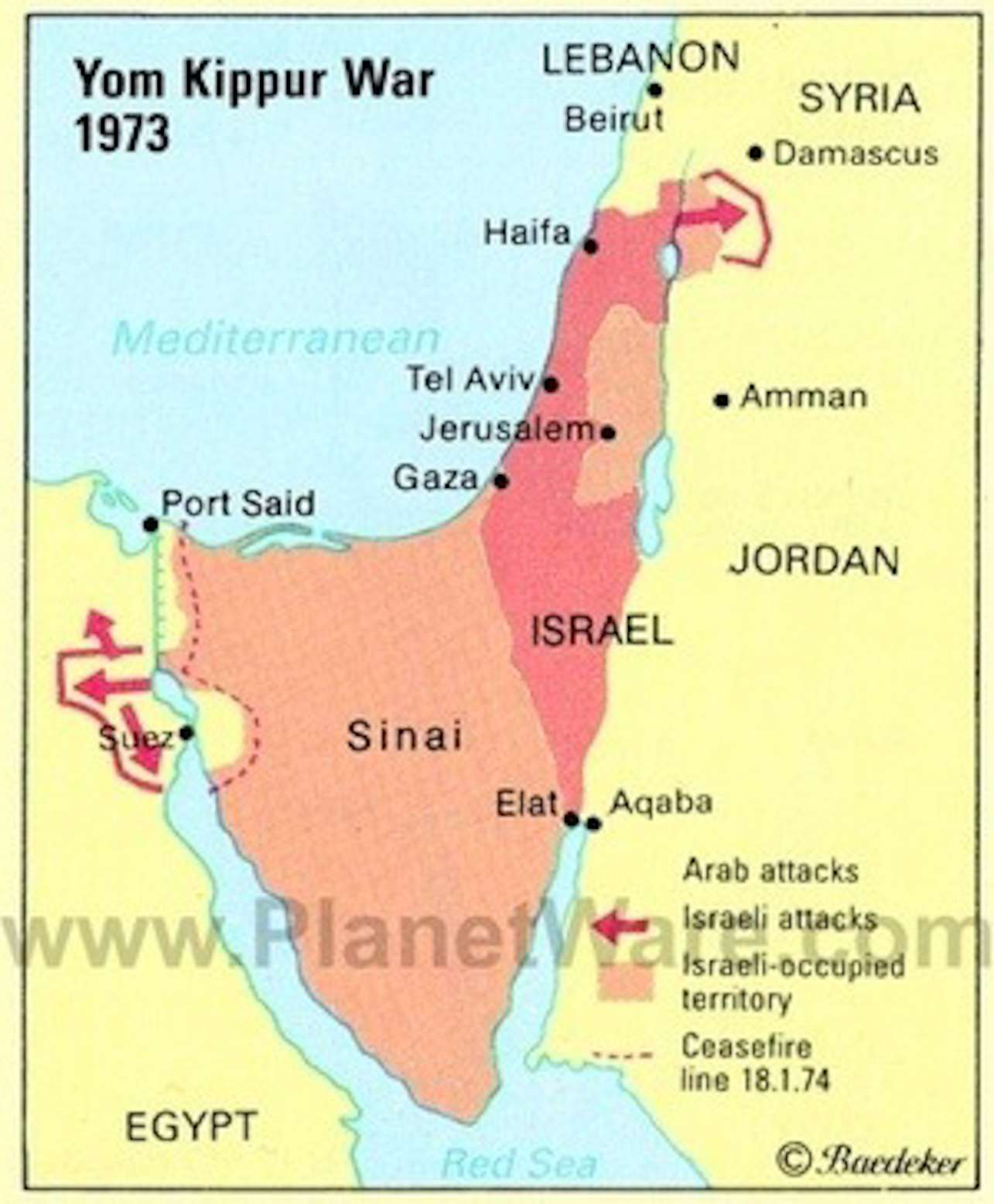 En 1967, les Israéliens conquièrent le Golan, la Cisjordanie, Gaza et le Sinaï. En 1973, les Egyptiens franchissent le Canao de Suez. Après deux jours de déroute, les Israéliens reprennent le dessus, franchissent le Canal, et foncent vers Le Caire. Au Nord, ils progressent vers Damas. Ils conserveront la Péninsule du Sinaï, et notamment son pétrole, jusqu’en 1982, après le traité de paix Sadate/Begin à Camp David en 1978.